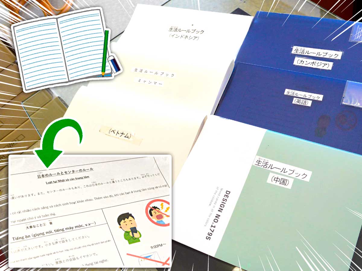 日本での生活知識の講習で使用しているのが、生活ルールブックです。6か国語(英語、中国語、インドネシア語、ベトナム語、ミャンマー語、カンボジア語)バージョンがあります。ルールブックの中には、「大声を出さないこと」や「夜間に洗濯機や掃除機を使わないこと」などの音に関するルールや、ゴミ出し分別ルールなど、日本での生活に困らないように様々なルールを掲載して教えています。