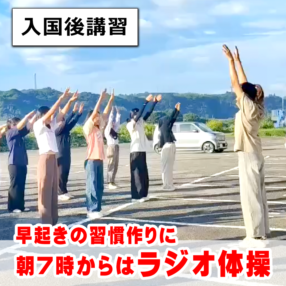 毎朝のラジオ体操は、技能実習生が健康を保ち、規則正しい生活リズムを築き、日本企業で安心して働くための大切な準備のひとつです。当センターでは、こうした小さな取り組みを積み重ねることで、実習生が元気に学び、安心して働ける環境を整えてまいります。これからも実習生の成長と笑顔を支える入国後講習を続けていきます。