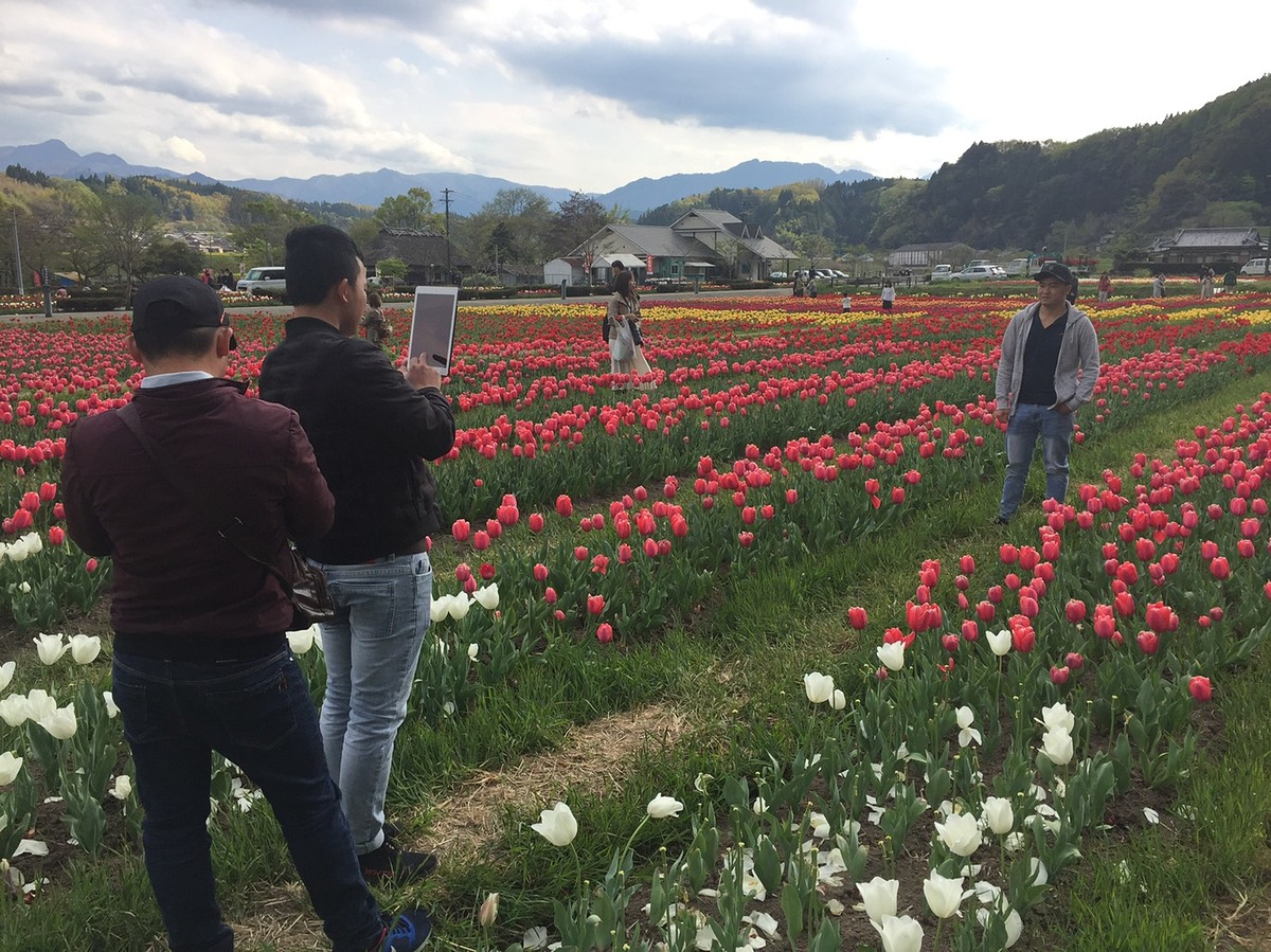 大分の観光名所、『原尻の滝』を見に行ったら、チューリップフェスタもやっており、そちらの方が喜んでいました。今回も女性に話しかけていましたが、どうやら一緒に写真をとってもらったようです。この辺の積極性を今の日本人男性も見習ってほしいものです。