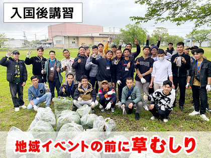 私が発案させていただいて、「バスの乗り方講習」や、「地域イベントの会場のを草むしり」などをしました。好きな場所じゃないとがんばる元気も出づらいと思いますので、実習生が、働く場所・地域が好きになれるように、地域と関わることことも講習の中に取り入れています。働きはじめて、職場と家の往復以外にも、地域のみなさんと挨拶したり、交流ができるようになると良いなと思っています。