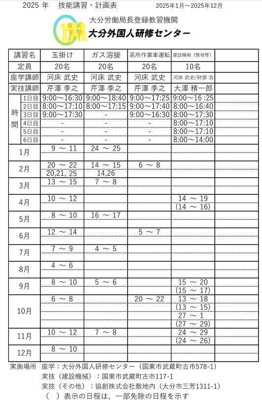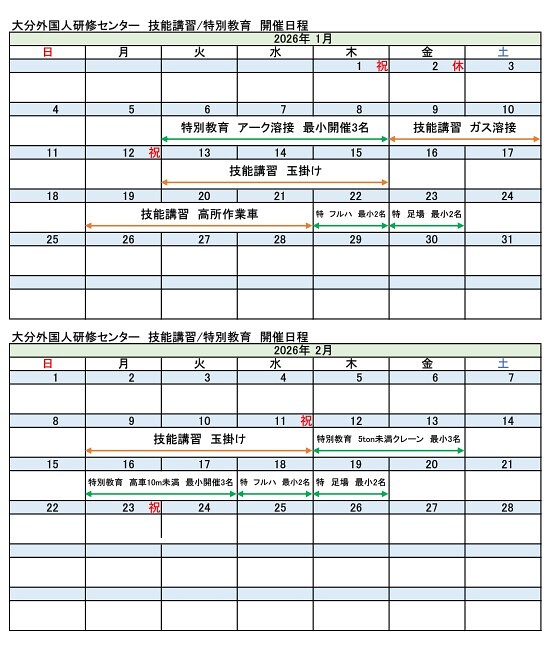 技能講習/特別教育の日程です。